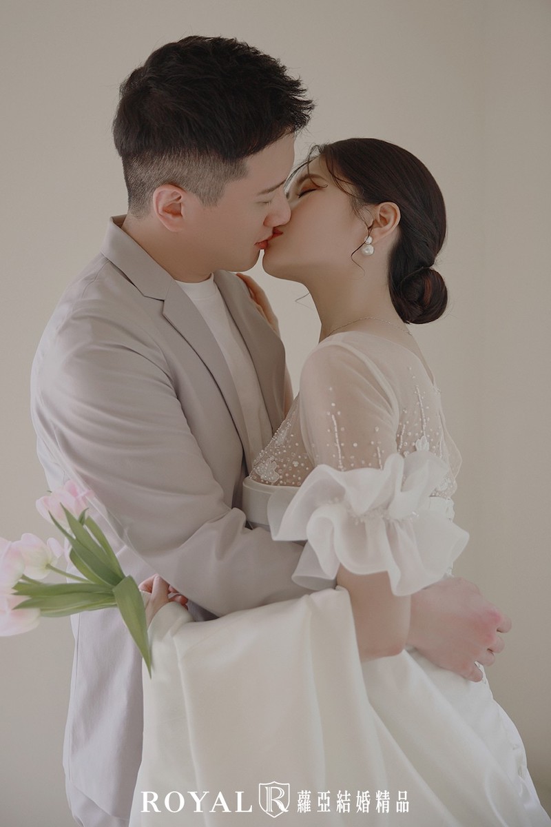 現在大多的時尚雜誌拍攝也多是使用素底空間拍攝為主,經典素背景婚紗照一直都是婚紗相本裡會出現經典風格,這也是小清新鹽系婚紗的精髓之一。在沒有其他雜物的干擾下,能將視覺焦點放在新人身上。