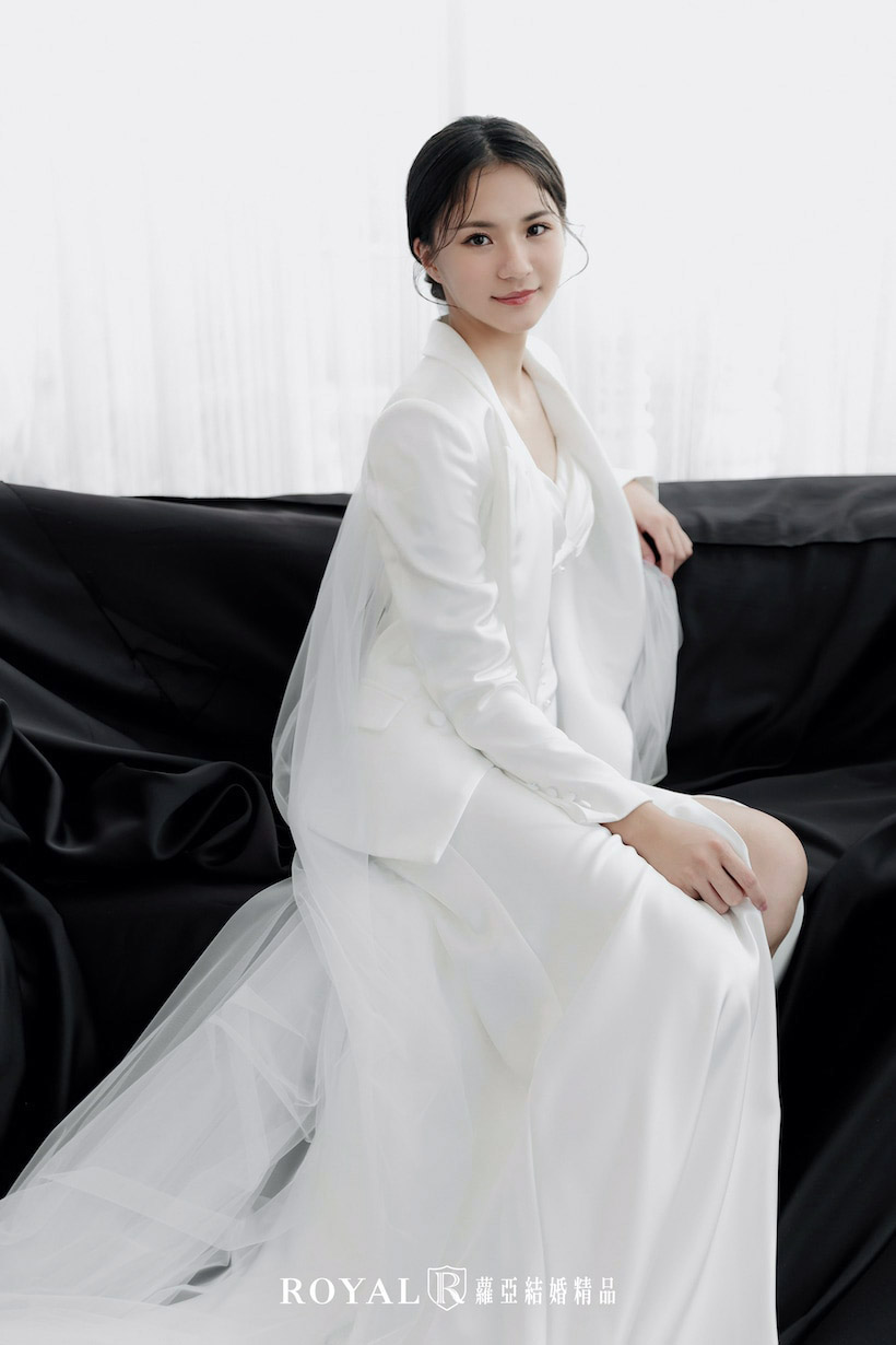 單穿裡面的魚尾禮服再搭配造型師妝髮,可以呈現美式慵懶感/韓式簡約風;搭上外套之後又轉變成帥氣俐落的感覺,多種場合都適合。