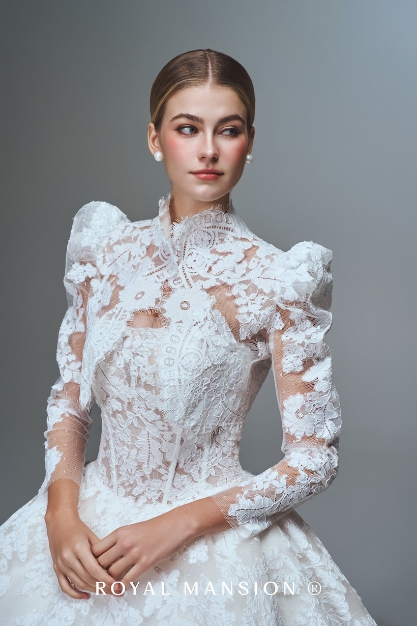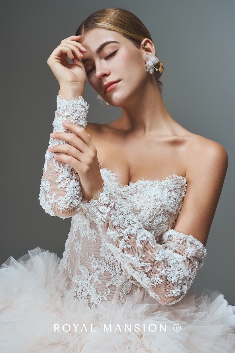 上身以輕透蕾絲勾勒細膩肌理,柔美中帶一點性感的呼吸感,讓浪漫在每一次回眸之間悄悄盛放,完美詮釋高訂公主的溫柔與力量。
