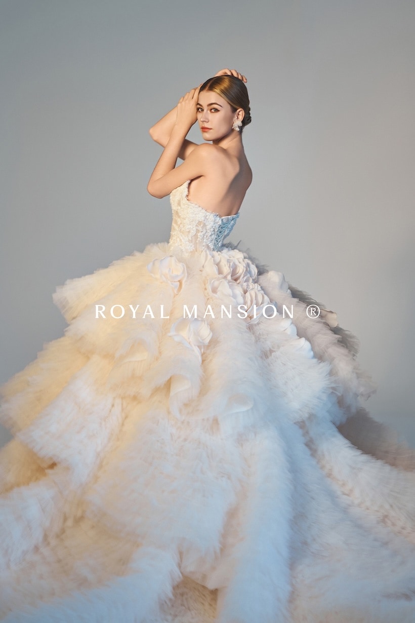 豐盈裙襬層層堆疊,展現輕盈空氣感,隨步伐溫柔流動,襯托新娘最夢幻的主角光暈。